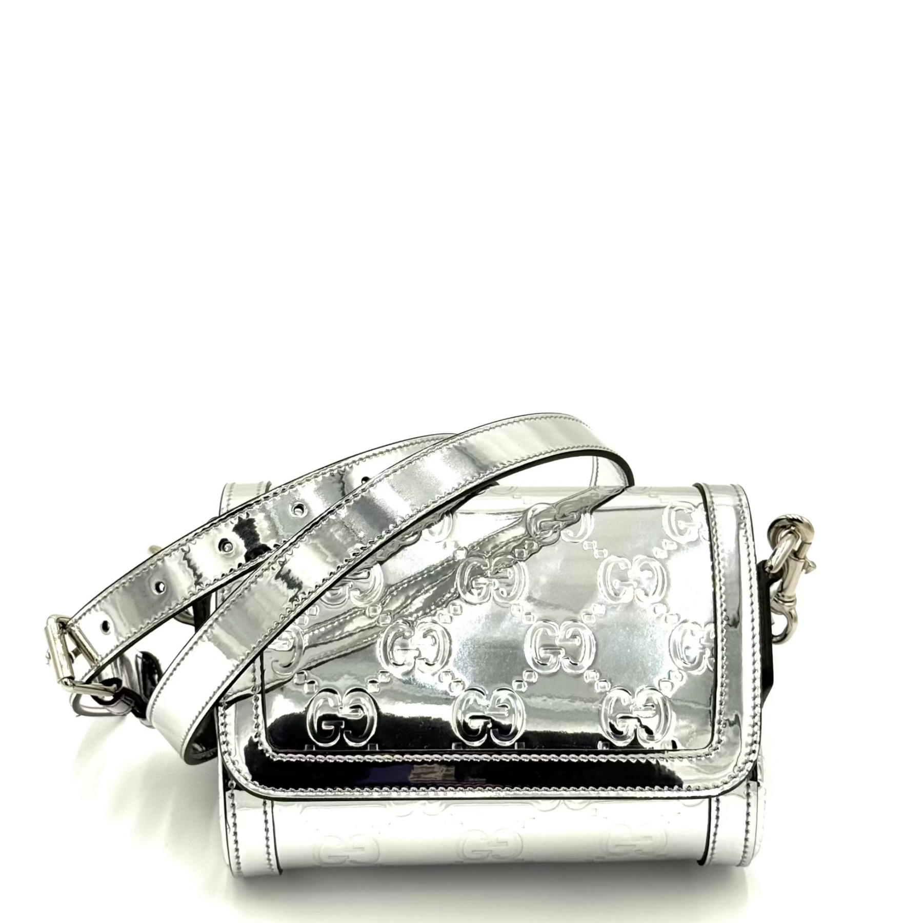 Double-G embossing makes a bold statement on a shiny metallic leather bag topped with an adjustable strap for easy crossbody wear.