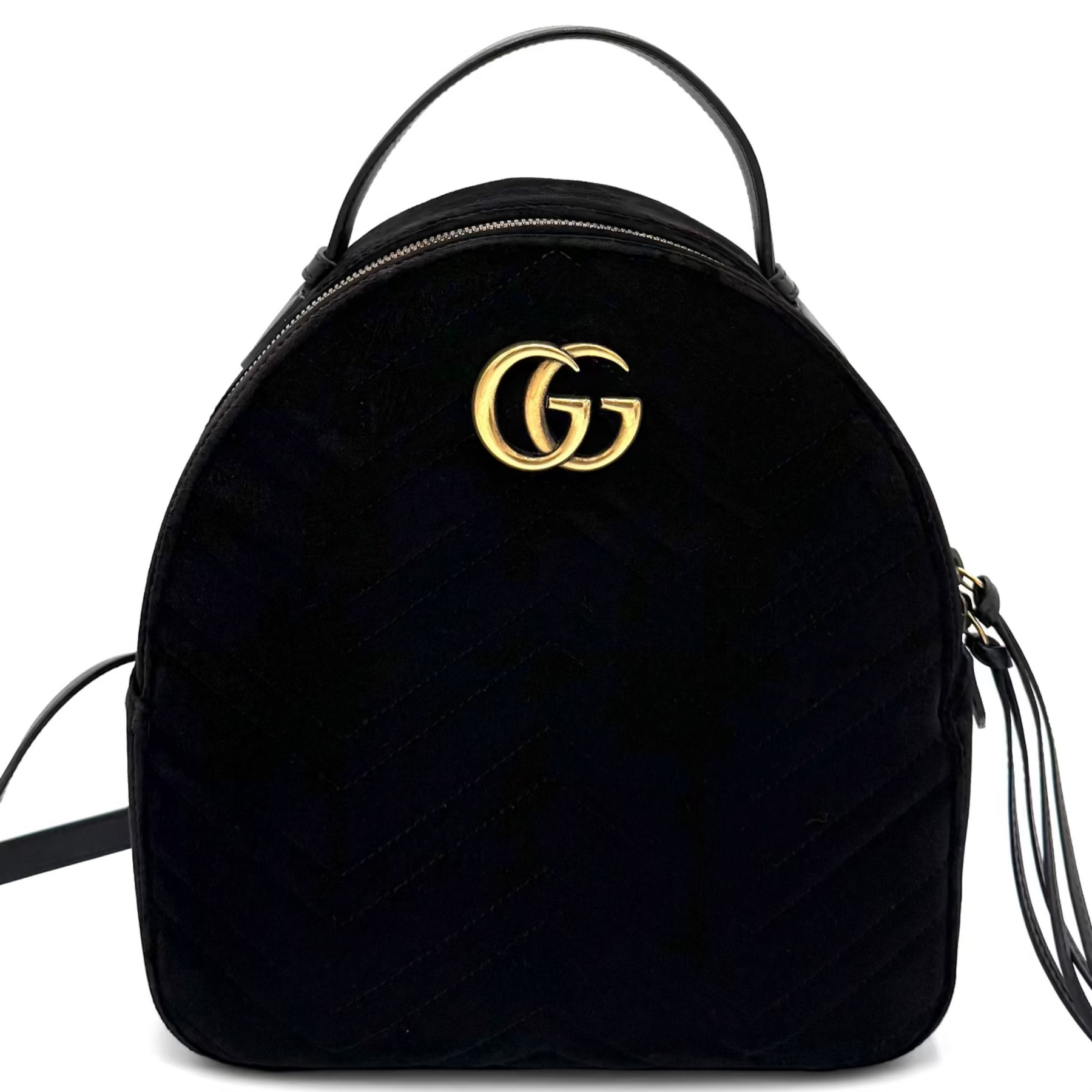 Luxe texture meets iconic design in this GG Marmont backpack by Gucci. Crafted from sumptuous black velvet, this elegant piece showcases the signature matelassé chevron pattern and is finished with the instantly recognizable double G emblem in burnished gold.