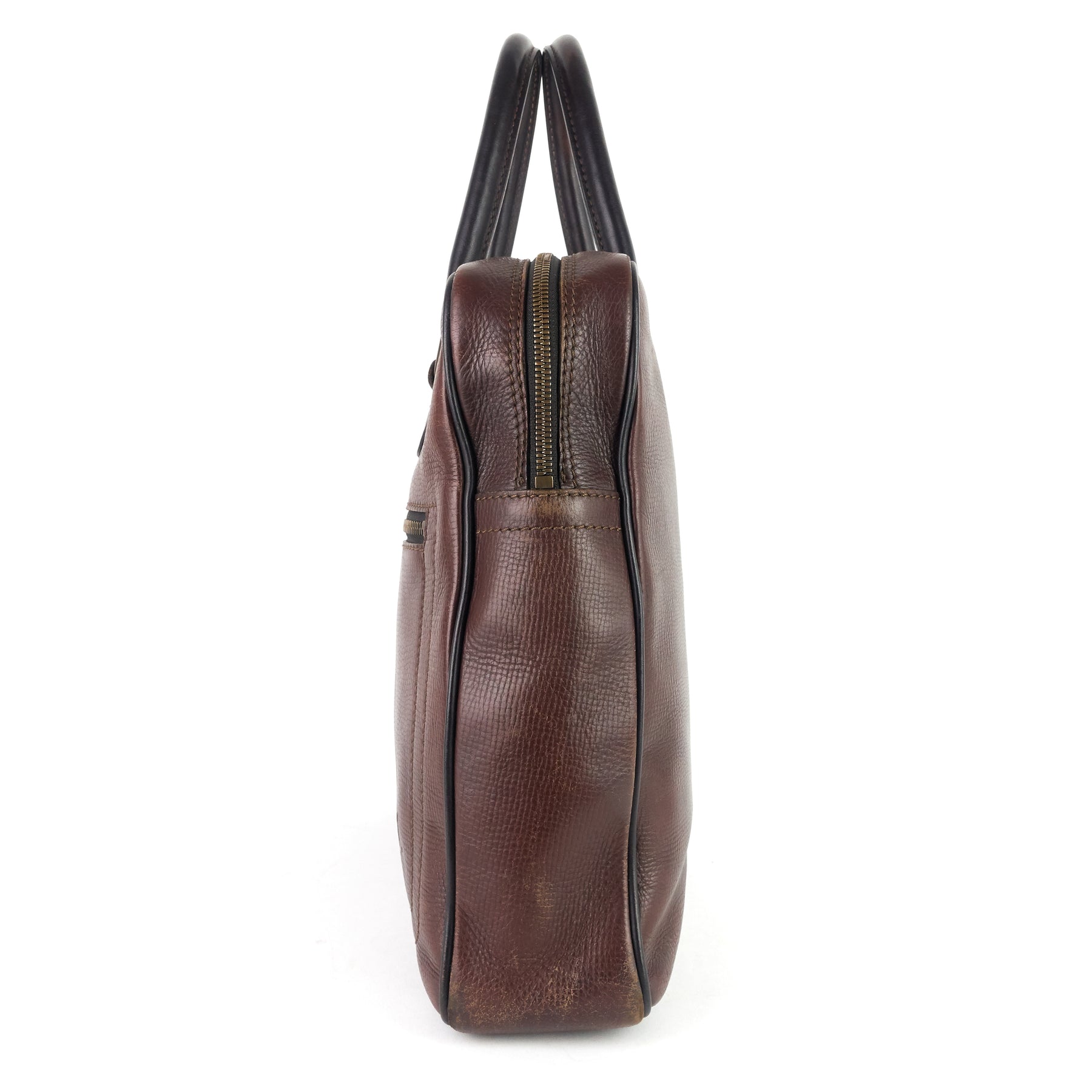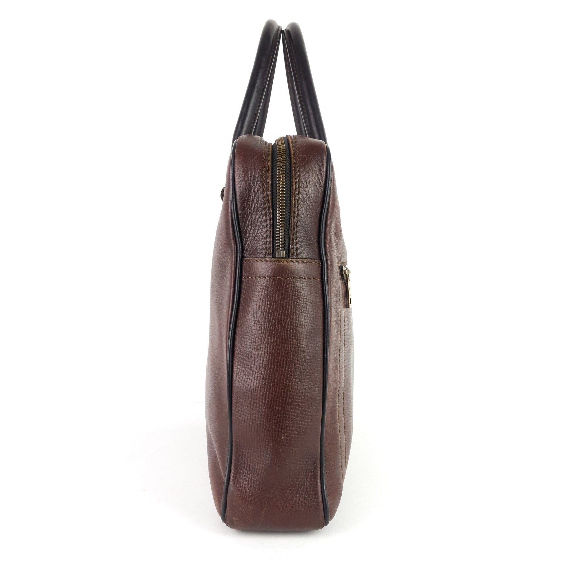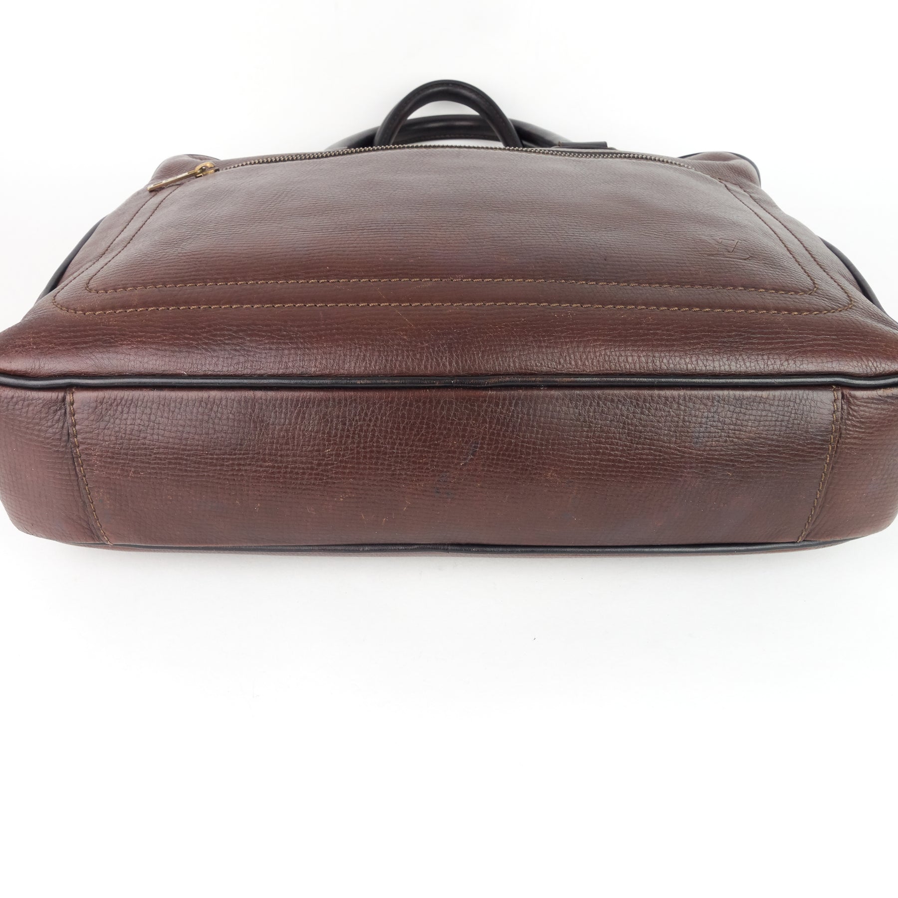 A spacious leather bag designed to safely transport your laptop and important workday documents. It is made from richly grained leather with black contrast edges, lined with light brown fabric, and finished with bronze-coloured hardware.