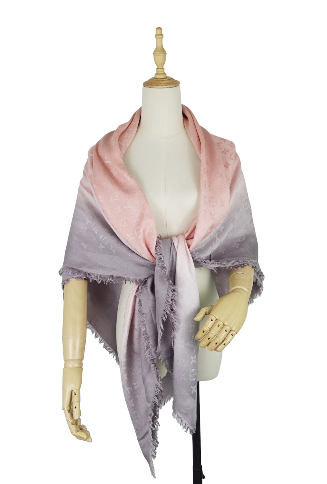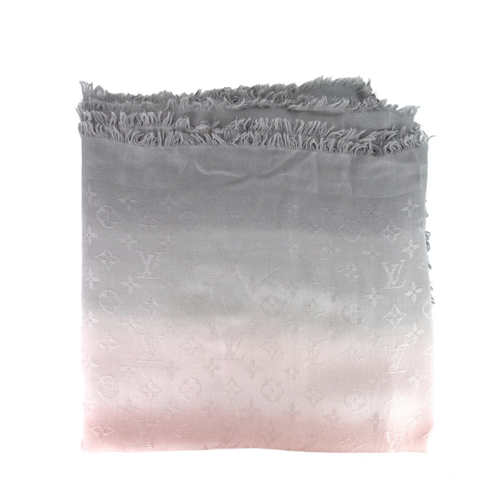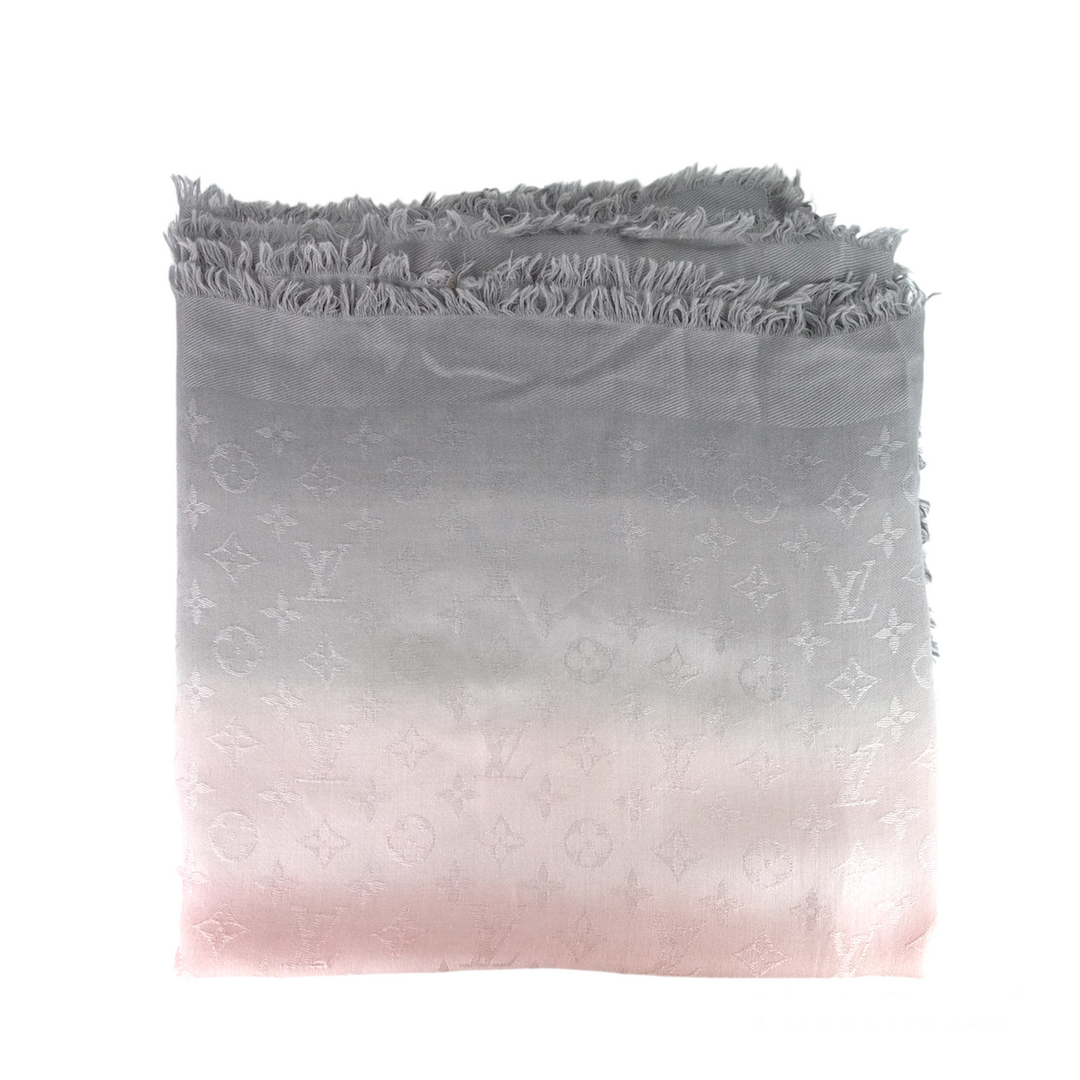 An Italian-crafted shawl made from a silk-and-wool blend features a tone-on-tone monogram pattern and an ombre effect of grey, purple and pink.