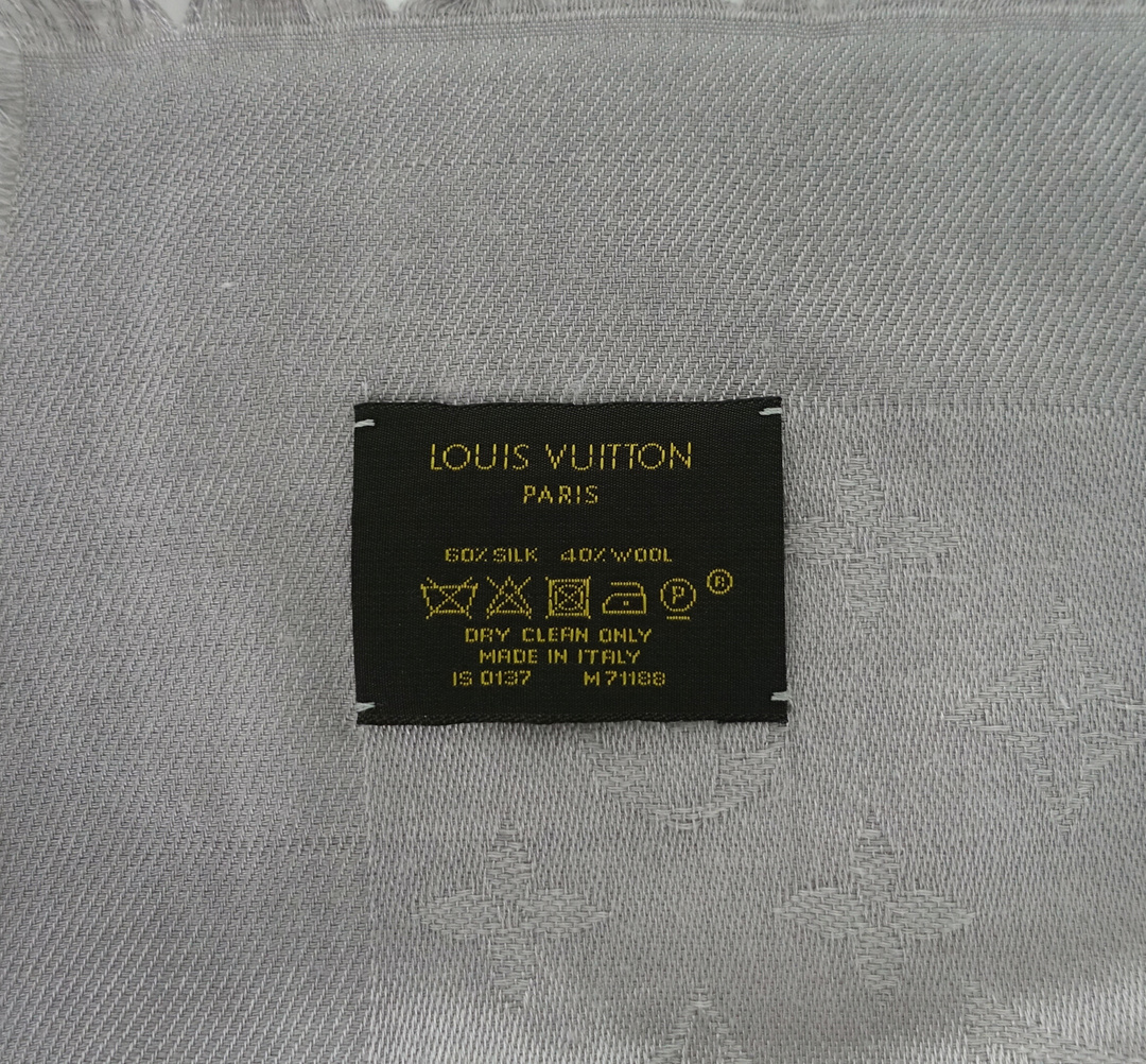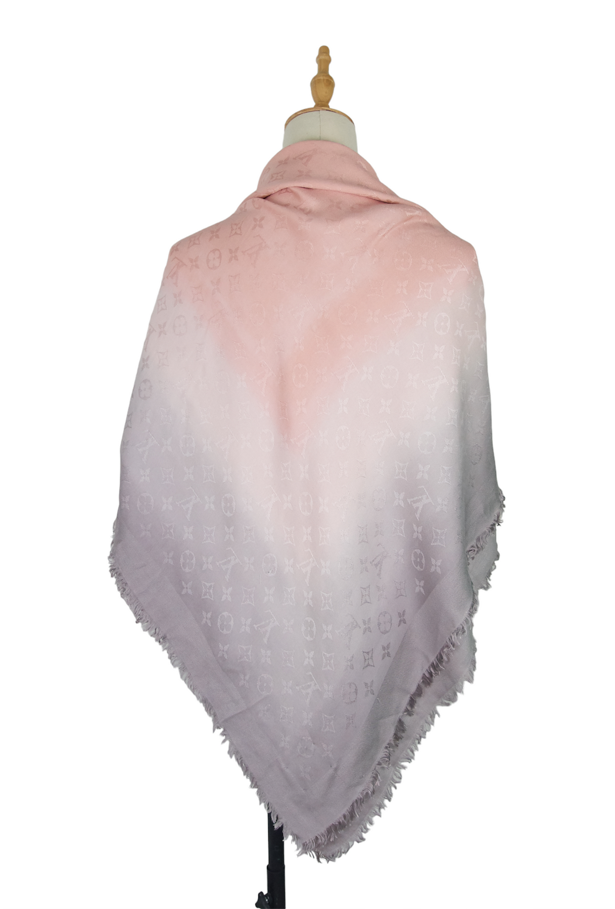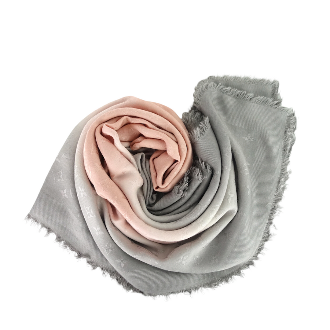 An Italian-crafted shawl made from a silk-and-wool blend features a tone-on-tone monogram pattern and an ombre effect of grey, purple and pink.