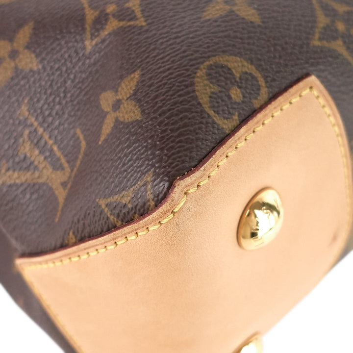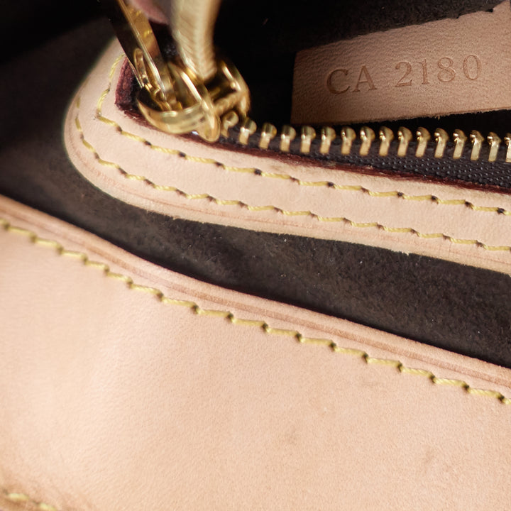 Designed in an everyday size, fashion-forward tote is made from signature monogrammed canvas with goldtone hardware, natural cowhide leather trim and straps, and a chocolate-coloured microfiber lining.