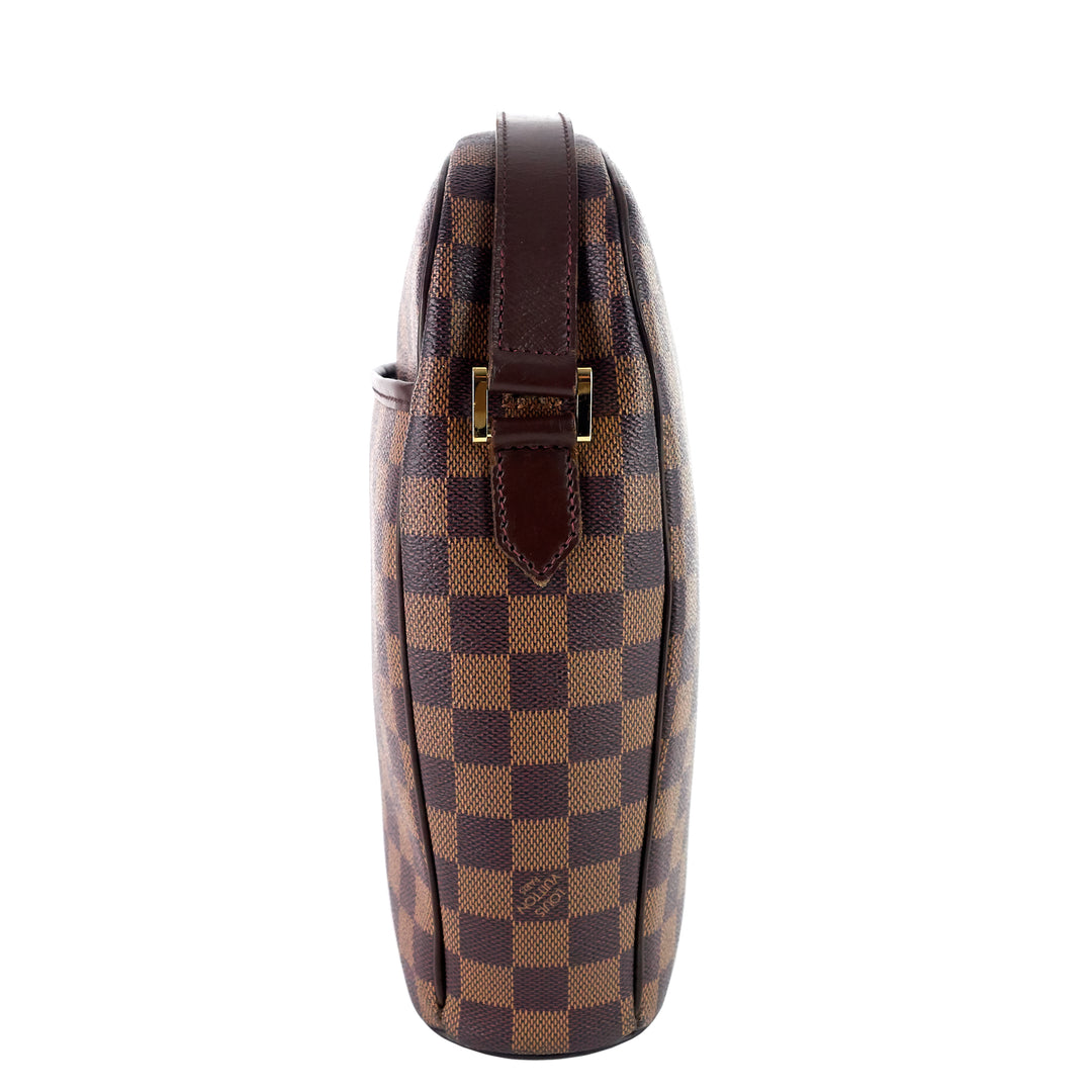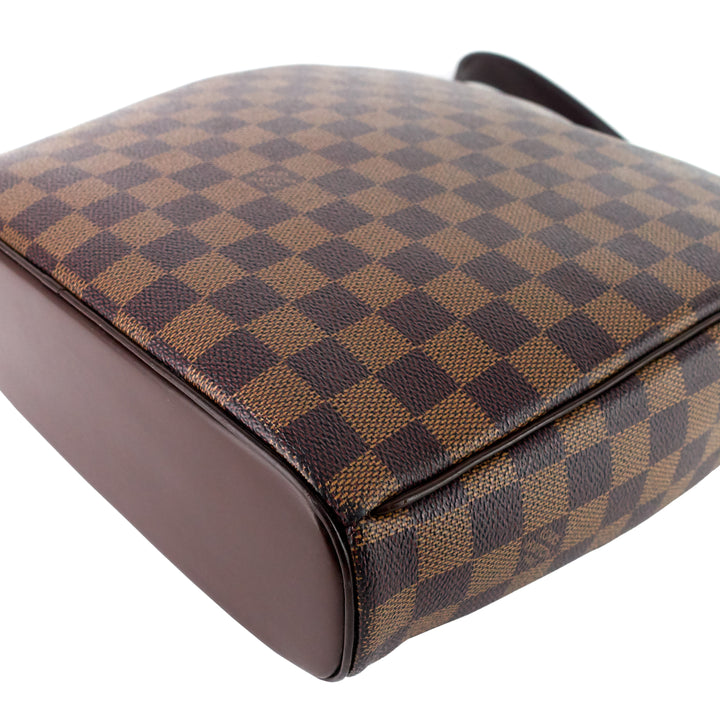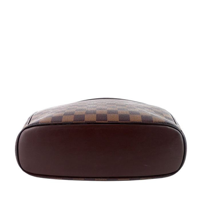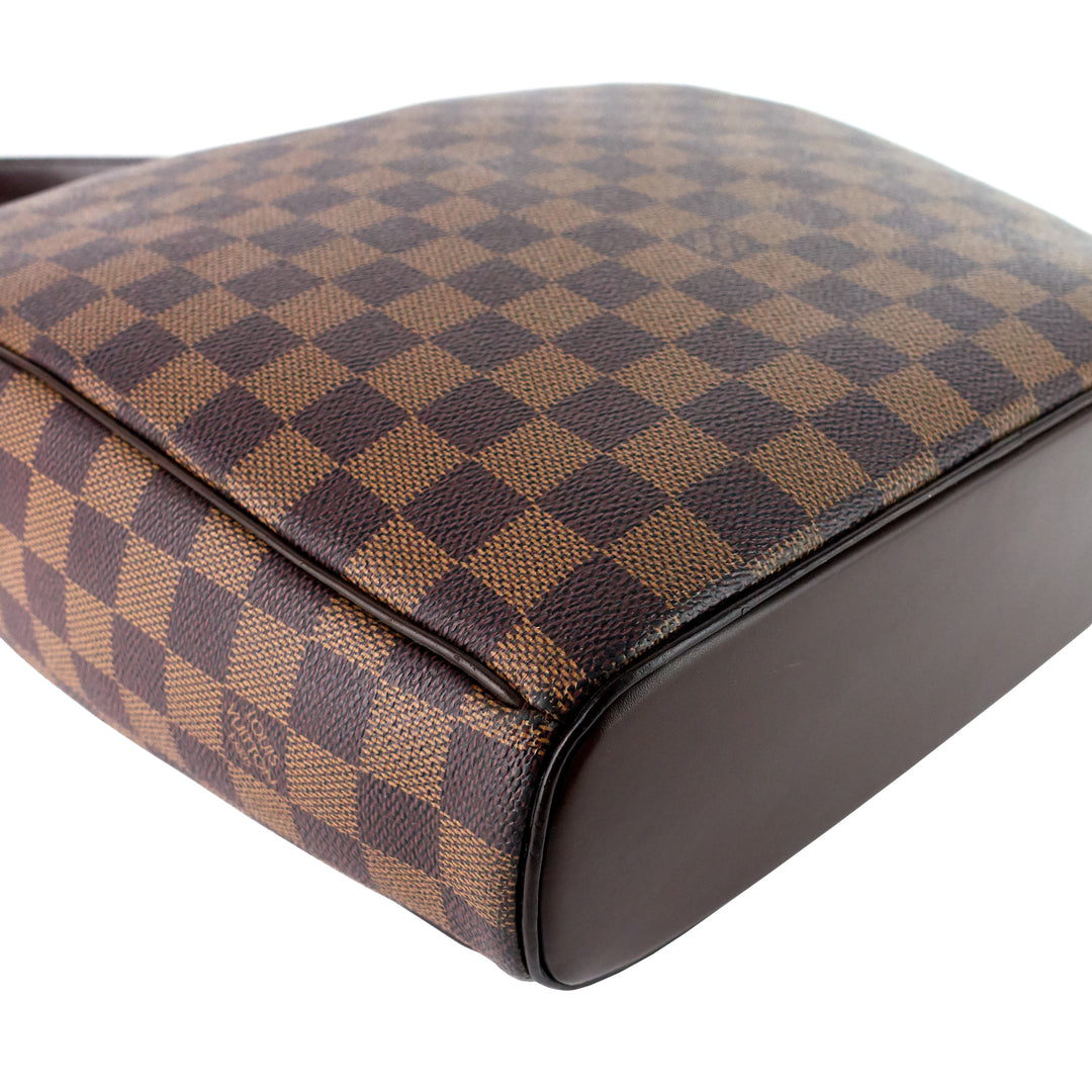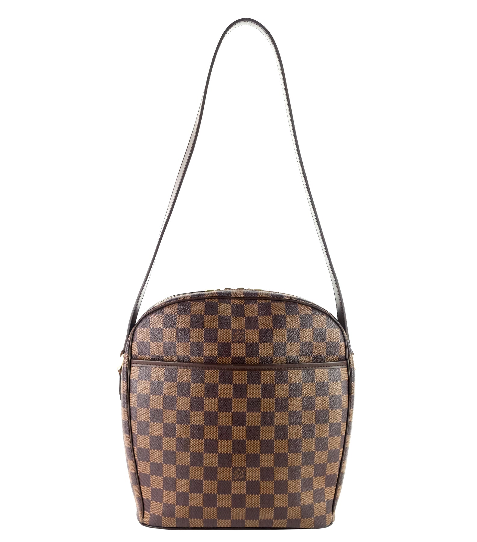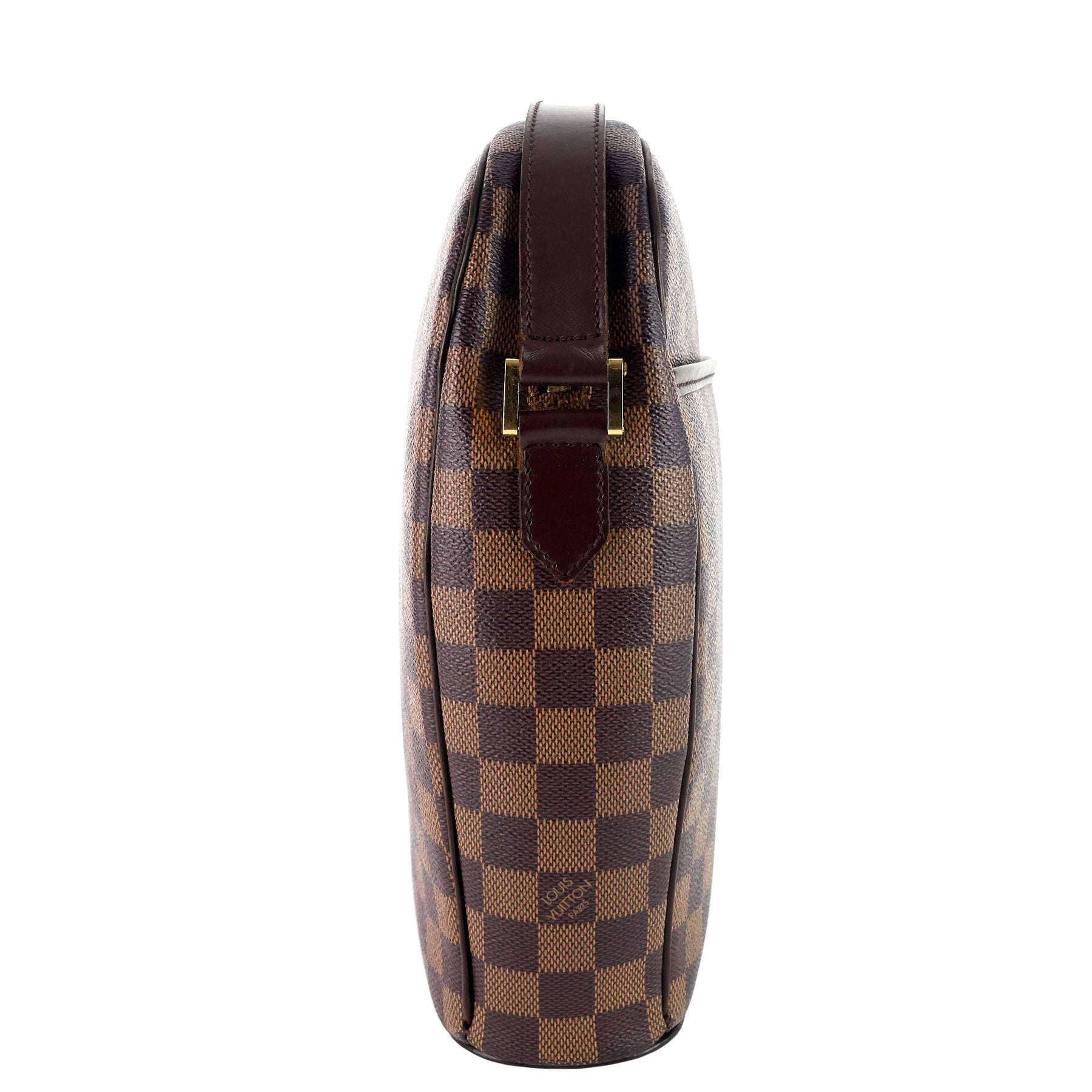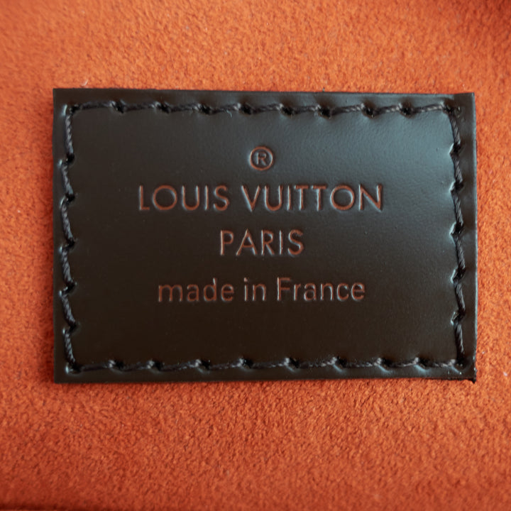 Damier Ebene coated canvas with tonal cowhide leather trim crafts a structured shoulder bag lined in buttery-soft microfiber and topped with a flat strap.