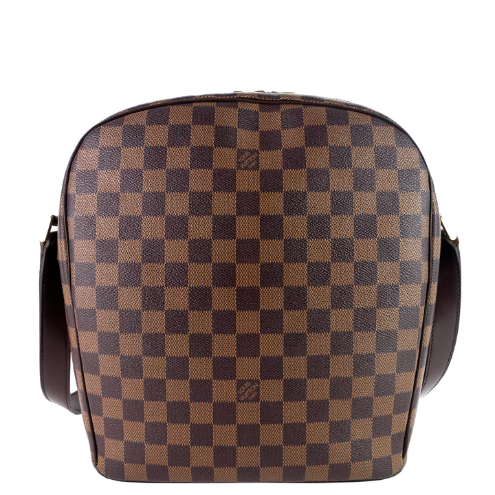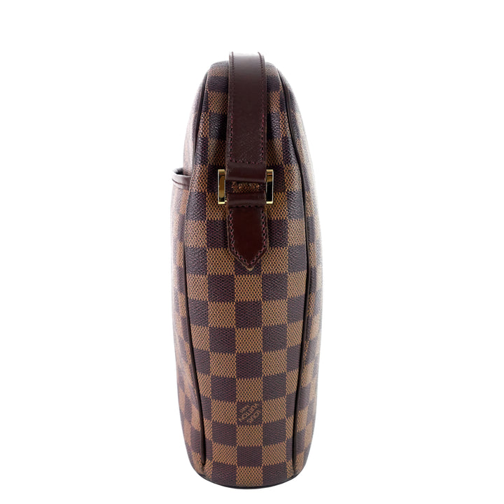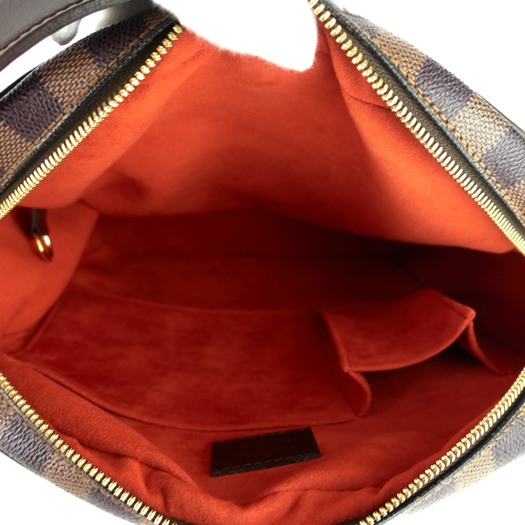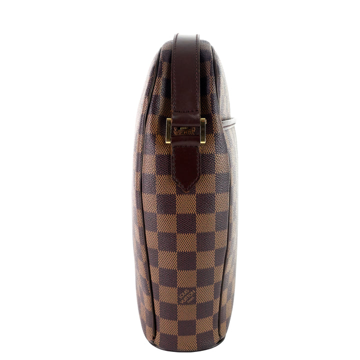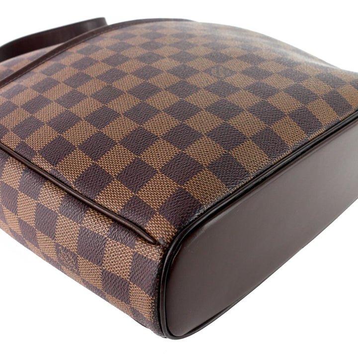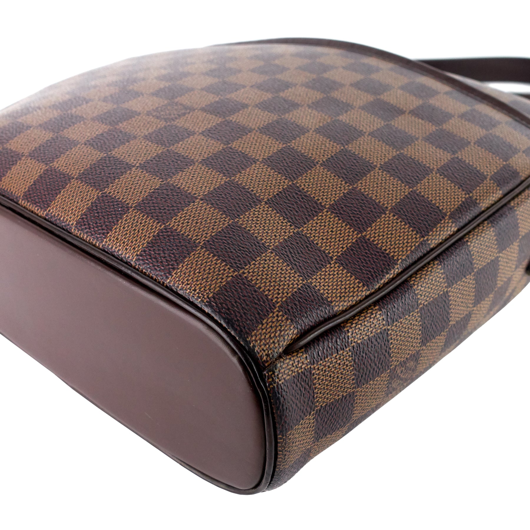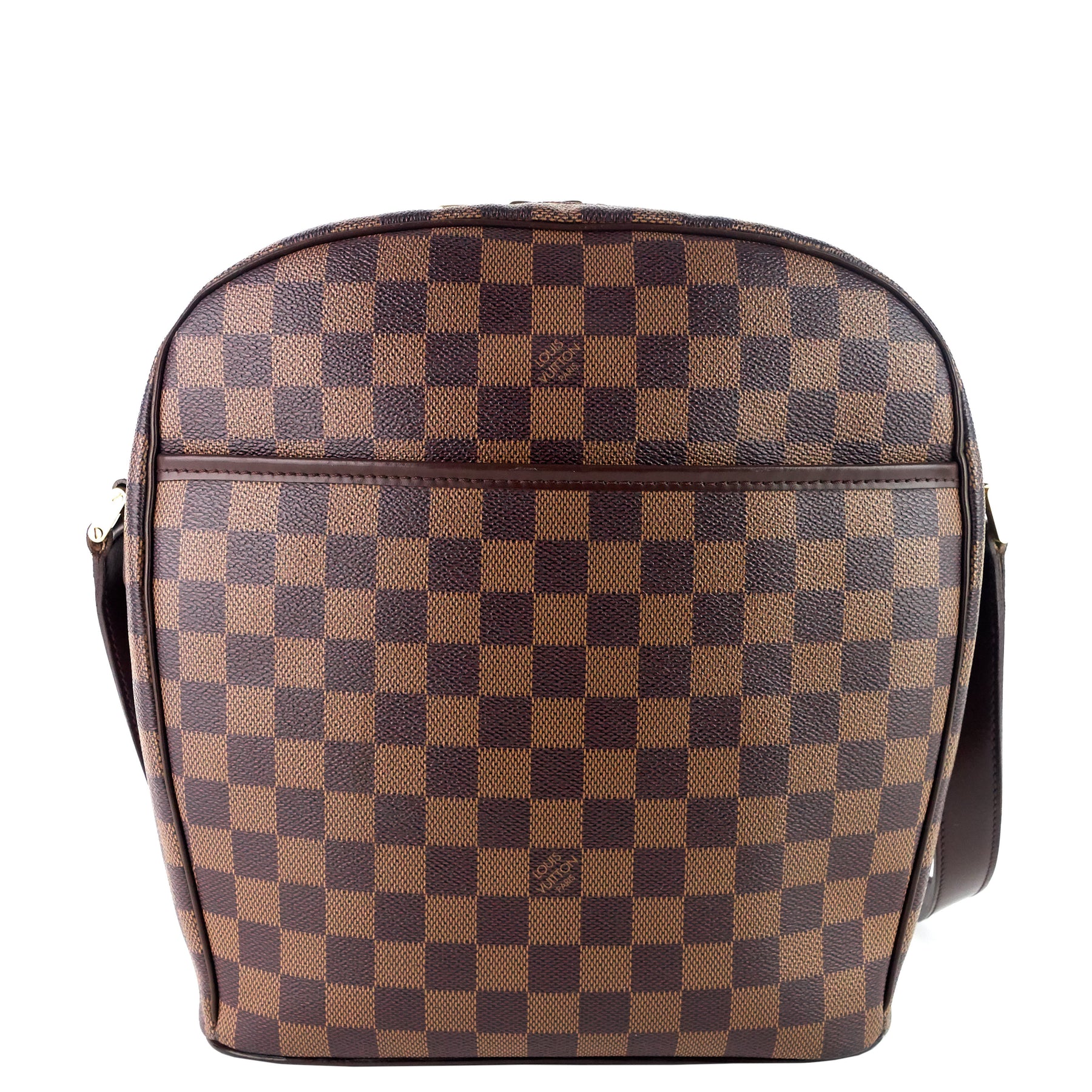 Damier Ebene coated canvas with tonal cowhide leather trim crafts a structured shoulder bag lined in buttery-soft microfiber and topped with a flat strap.