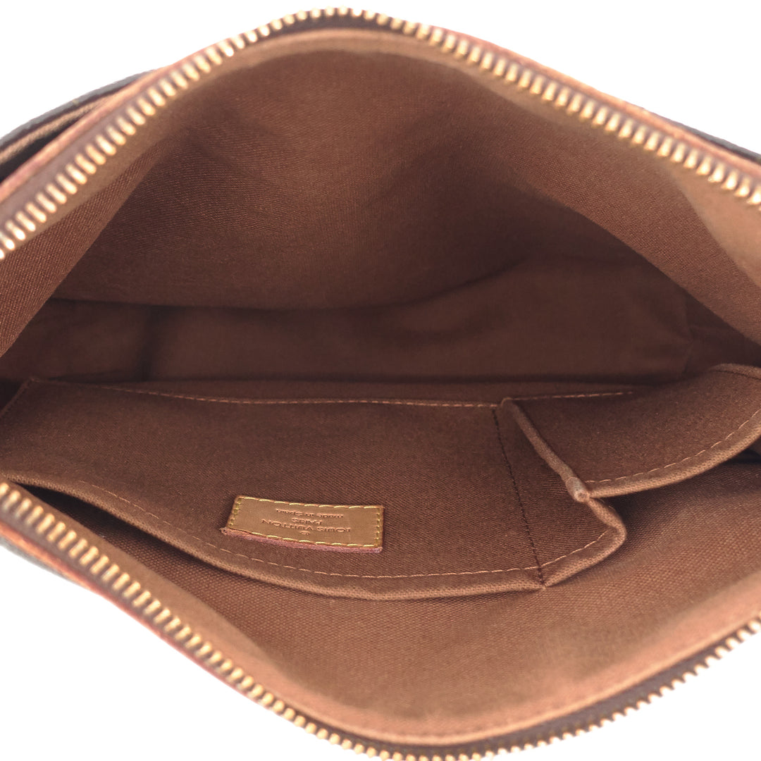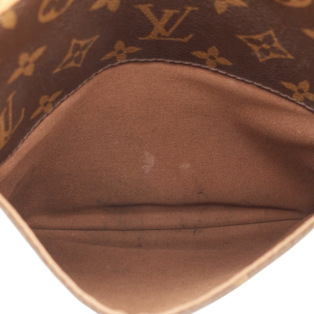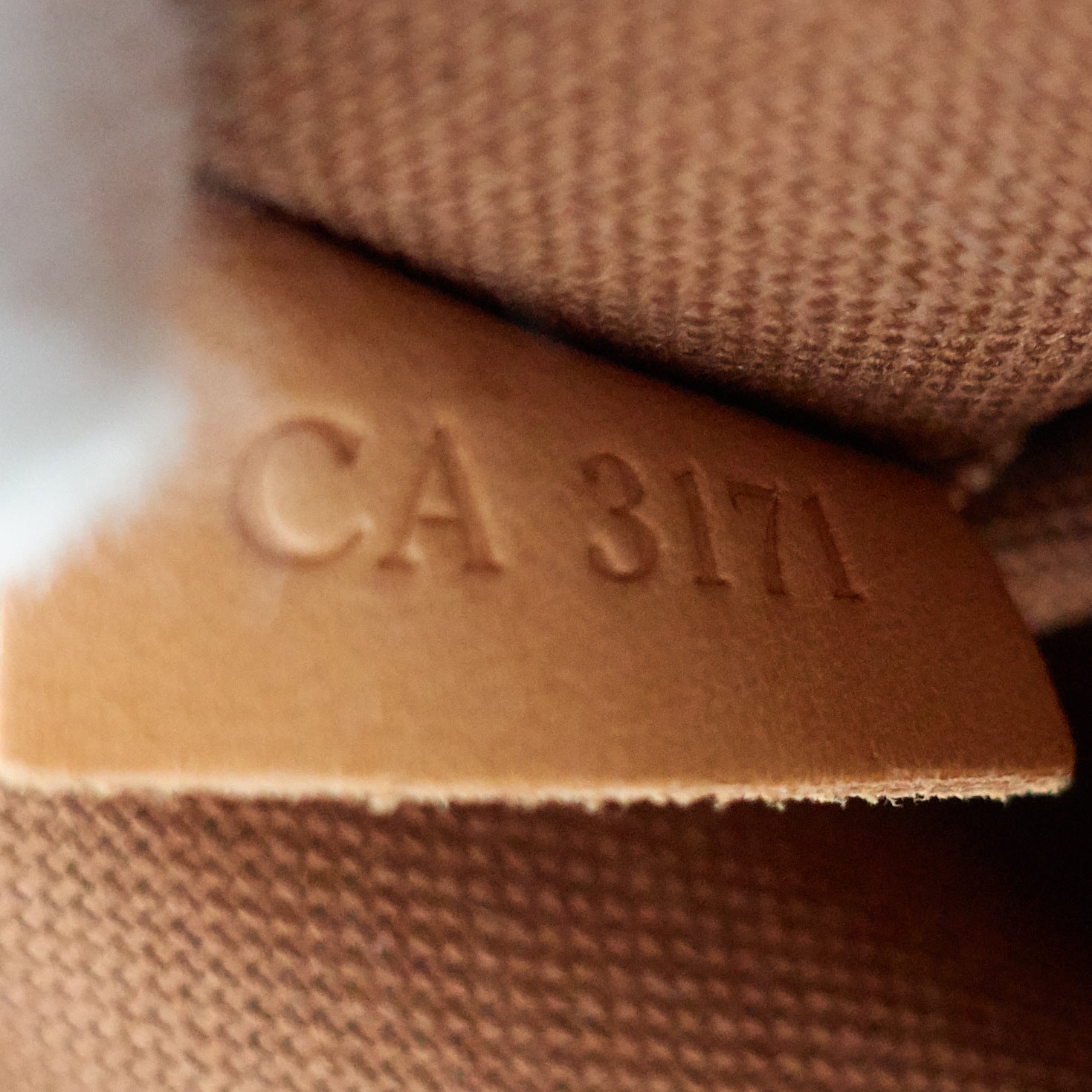 Overall: The outer coated canvas has no noticeable wear. The cowhide leather trim and strap have a well-developed patina, as well as scuff marks, scratches, and creases. Additionally, the strap has softened, and the glazing at the edges shows wear where it loops around the bag's anchors. The main interior compartment is clean with no visible wear. However, there is staining inside the cellphone pocket and the exterior front pocket. The hardware shows light scratches.