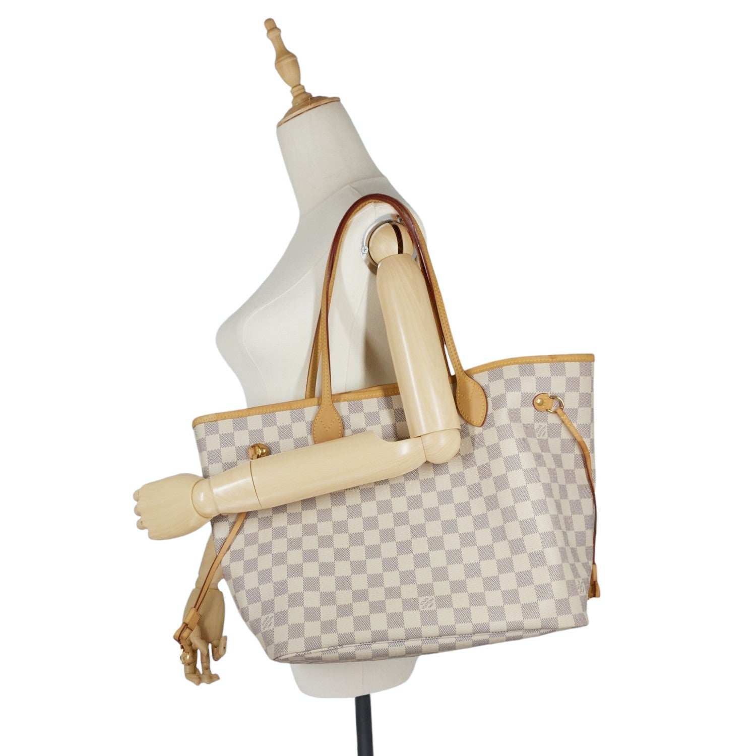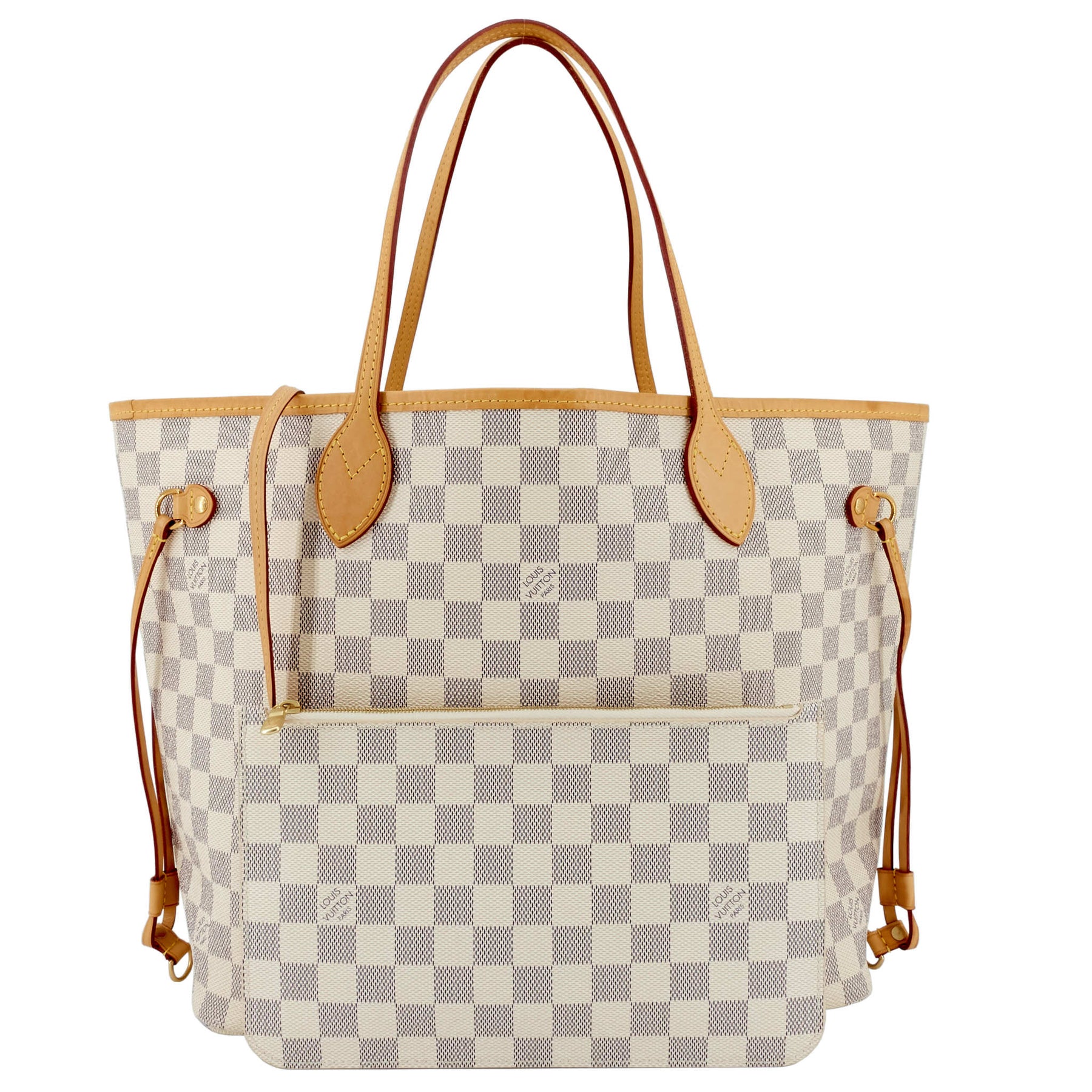A roomy tote crafted from Damier Azur coated canvas with gleaming golden hardware and a durable textile lining. As the name suggests, it was designed to "never be full," and will easily accommodate the daily essentials and then some. It can be worn over the shoulder or on the elbow thanks to the long top-handles. It comes with a zipped pouch that can be removed and carried separately as a chic clutch.