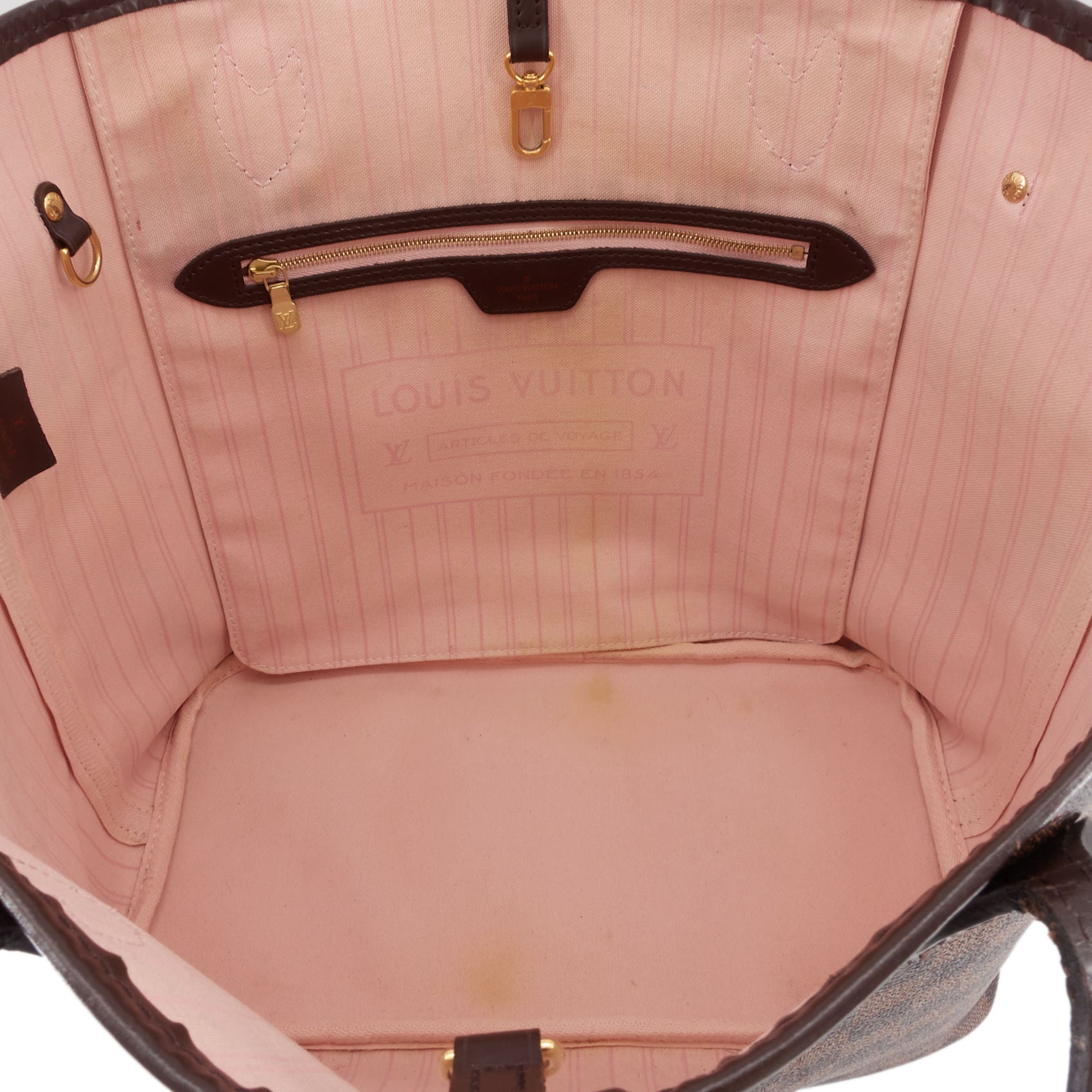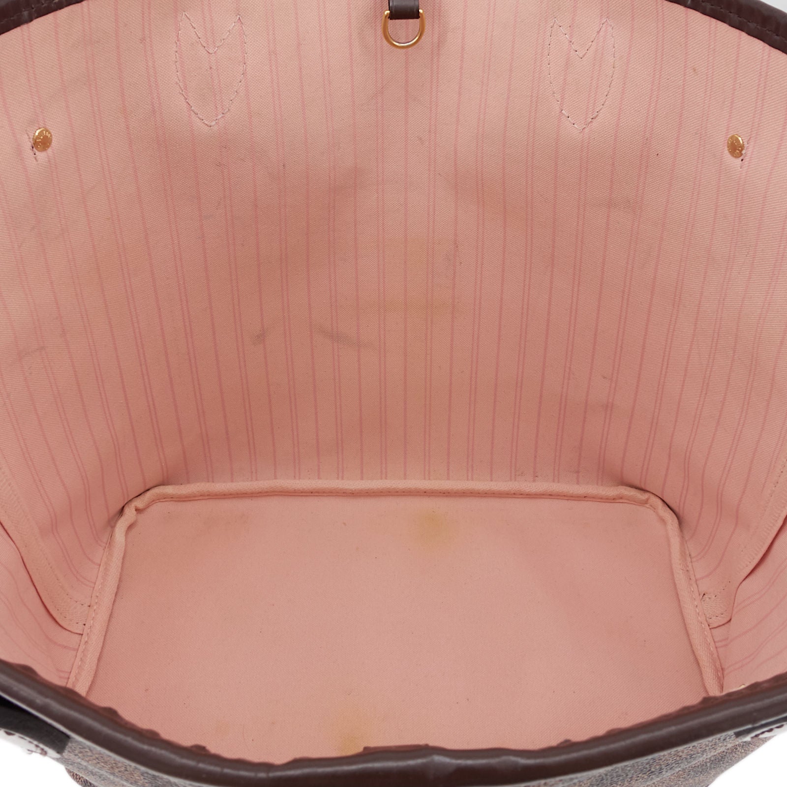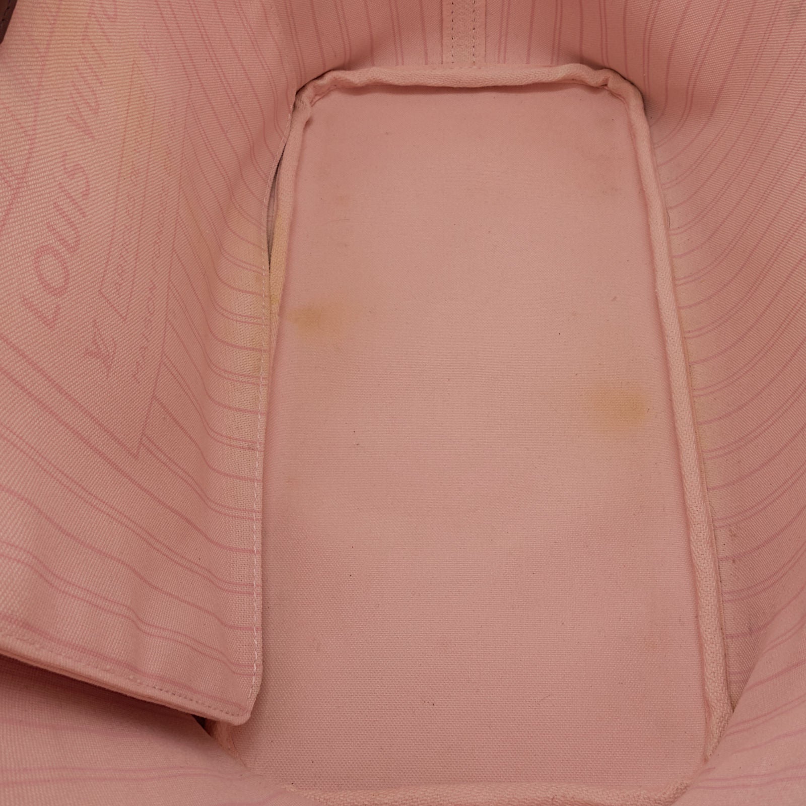 Overall: The exterior coated canvas has light scuffing on the bottom corners, while the exterior leather trim and straps have scratches, scuff marks, dents, and cracks. The interior lining shows the most noticeable wear, with staining throughout.