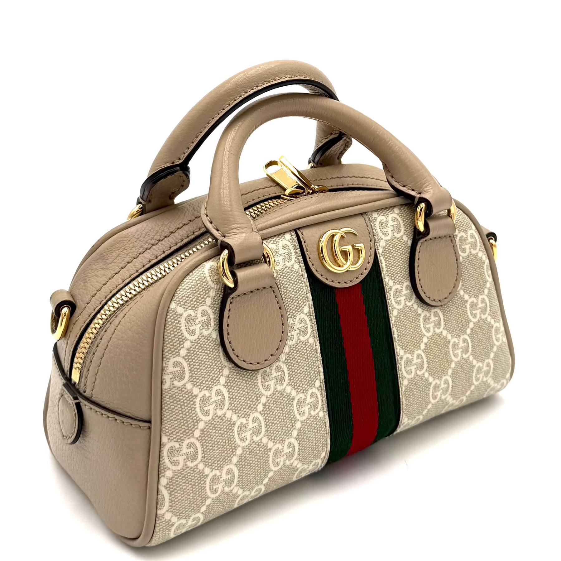 Smooth leather trim and polished gold-tone hardware elevate the structured bowler shape, while the signature Double G emblem adds a touch of vintage sophistication. The top-zip closure opens to a neatly sized interior, perfect for carrying everyday essentials. A sturdy top handle and detachable shoulder strap offer versatile styling options, from hand-carried elegance to effortless crossbody wear.