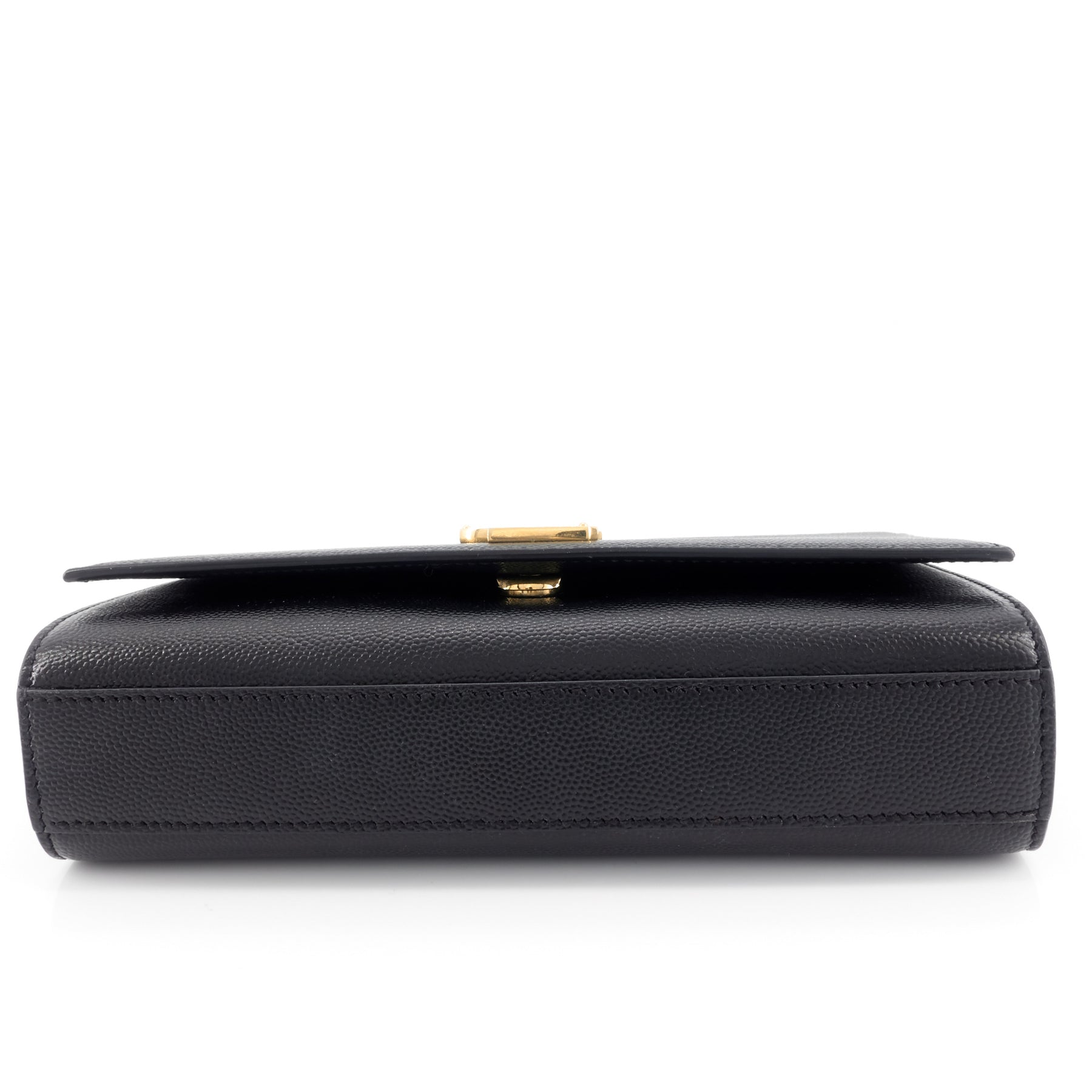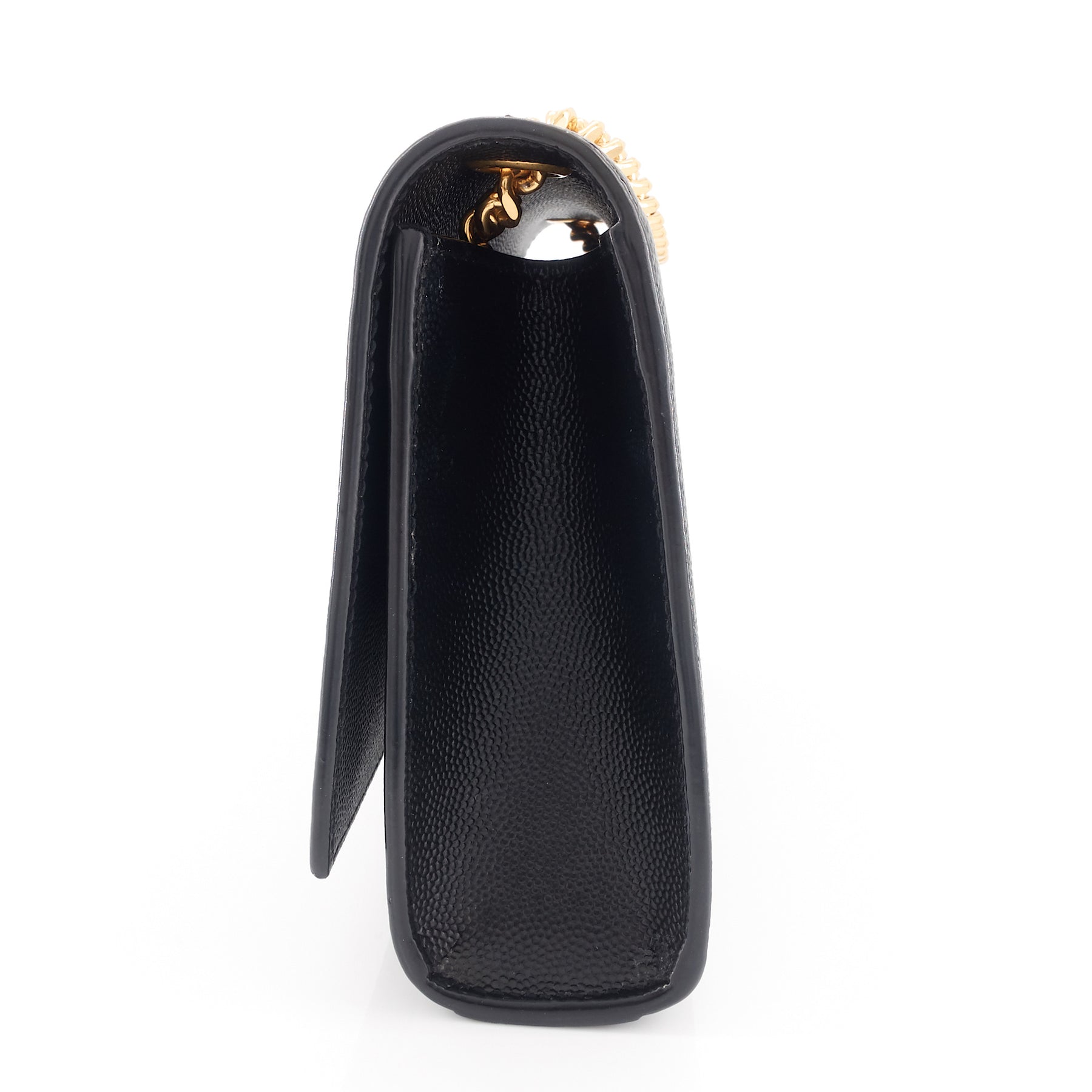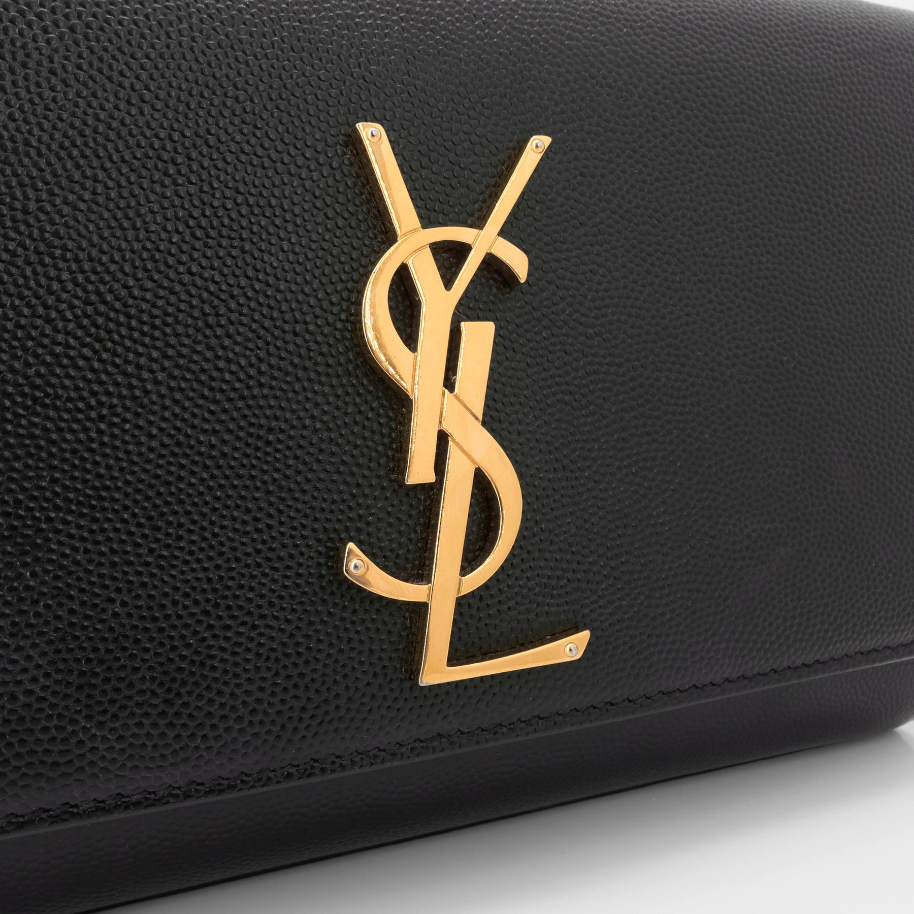 Gleaming YSL hardware contrasts beautifully against the black pebbled leather of a streamlined shoulder bag designed to carry your essentials in the chicest way possible.